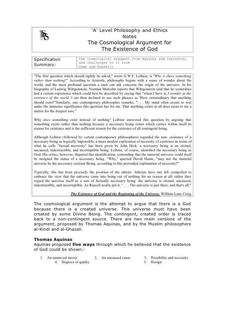 Thomas Aquinas offered one of the first versions of the Cosmological argument that shows how the existence of God came to be. Both the Cosmological and Teleological Design argument for the existence of God argue "a posteriori", in that, cosmological argument essay, they look to science to substantiate God's existence.